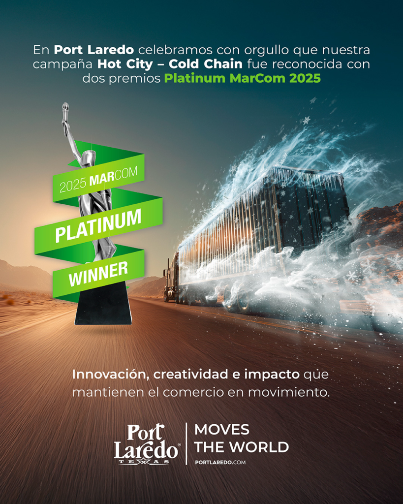 LAREDO, Texas.- Port Laredo fue reconocido con dos premios Platinum en los MarCom Awards 2025, la máxima distinción internacional en creatividad y comunicación, por su innovadora campaña “Hot City – Cold Chain”, que posiciona a Laredo, Texas, como el puerto interior líder de América del Norte en logística de cadena fría.